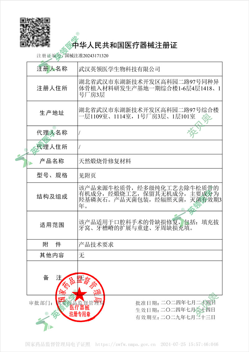 2024年7月24日,武汉英领医学生物科技有限公司自主研发的“天然煅烧骨修复材料”成功获得医疗器械注册证(国械注准20243171320)。该产品的获批,标志着我们在医疗健康领域的又一重大里程碑。
