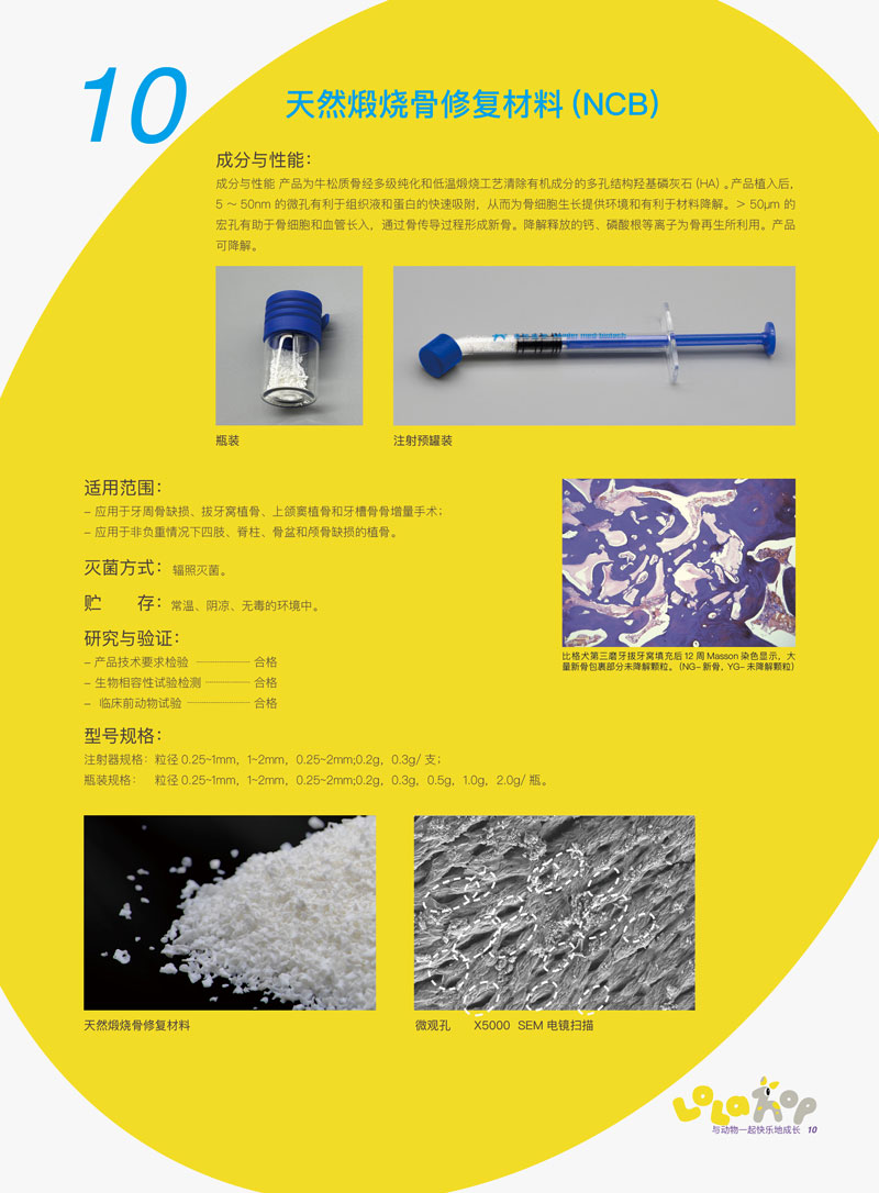 成分与性能 产品为牛松质骨经多级纯化和低温煅烧工艺清除有机成分的多孔结构羟基磷灰石(HA)。产品植入后,5 ~ 50nm 的微孔有利于组织液和蛋白的快速吸附,从而为骨细胞生长提供环境和有利于材料降解。> 50μm 的宏孔有助于骨细胞和血管长入,通过骨传导过程形成新骨。降解释放的钙、磷酸根等离子为骨再生所利用。产品可降解。