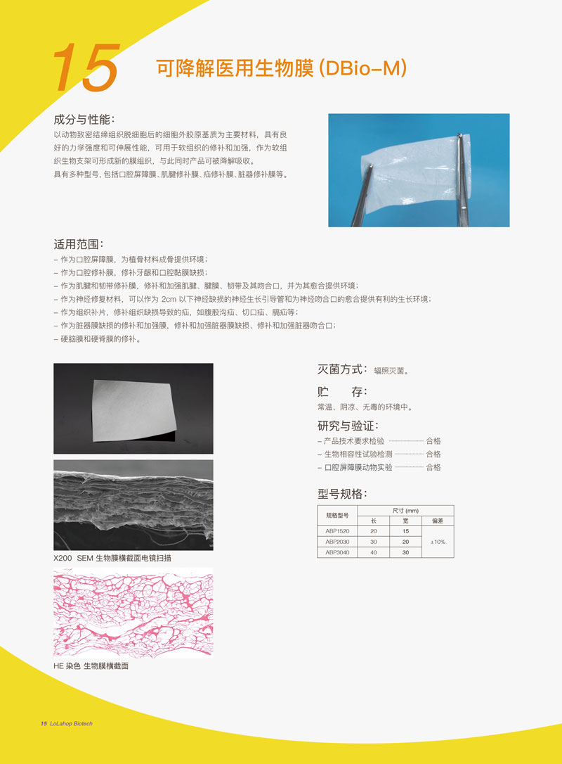 以动物致密结缔组织脱细胞后的细胞外胶原基质为主要材料,具有良好的力学强度和可伸展性能,可用于软组织的修补和加强,作为软组织生物支架可形成新的膜组织,与此同时产品可被降解吸收。具有多种型号,包括口腔屏障膜、肌腱修补膜、疝修补膜、脏器修补膜等。