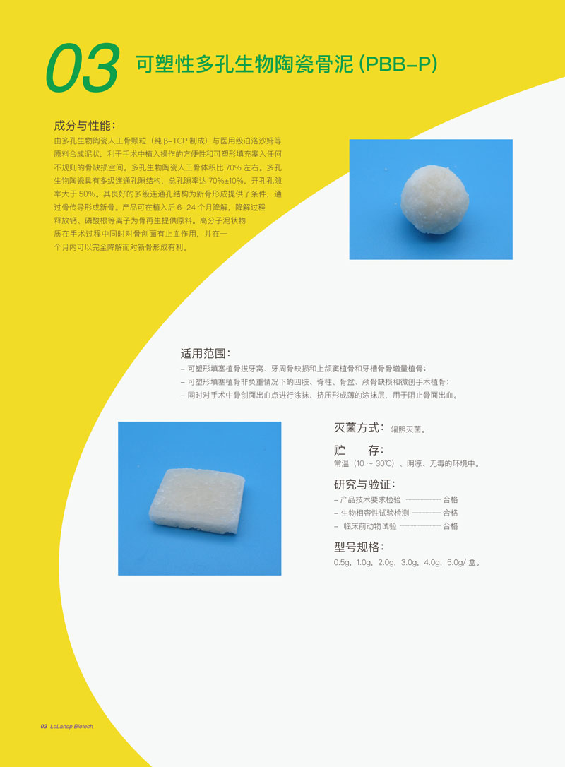 由多孔生物陶瓷人工骨颗粒(纯 β-TCP 制成)与医用级泊洛沙姆等原料合成泥状,利于手术中植入操作的方便性和可塑形填充塞入任何不规则的骨缺损空间。多孔生物陶瓷人工骨体积比 70% 左右。多孔生物陶瓷具有多级连通孔隙结构,总孔隙率达 70%±10%,开孔孔隙率大于 50%。其良好的多级连通孔结构为新骨形成提供了条件,通过骨传导形成新骨。产品可在植入后 6-24 个月降解,降解过程释放钙、磷酸根等离子为骨再生提供原料。高分子泥状物质在手术过程中同时对骨创面有止血作用,并在一个月内可以完全降解而对新骨形成有利。