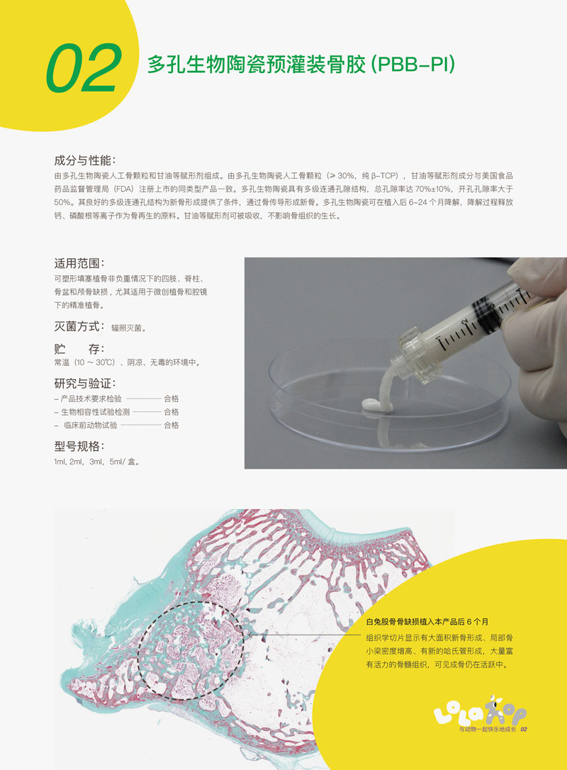 由多孔生物陶瓷人工骨颗粒和甘油等赋形剂组成。由多孔生物陶瓷人工骨颗粒(≥ 30%,纯 β-TCP),甘油等赋形剂成分与美国食品药品监督管理局(FDA)注册上市的同类型产品一致。多孔生物陶瓷具有多级连通孔隙结构,总孔隙率达 70%±10%,开孔孔隙率大于50%。其良好的多级连通孔结构为新骨形成提供了条件,通过骨传导形成新骨。多孔生物陶瓷可在植入后 6-24 个月降解,降解过程释放钙、磷酸根等离子作为骨再生的原料。甘油等赋形剂可被吸收,不影响骨组织的生长。