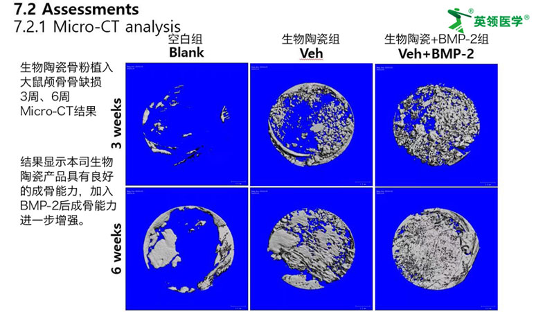 Made from pure β-TCP through advanced molding processes, this product has a total porosity of 70%±10%, with an open porosity rate greater than 50%. Its well-connected porous structure provides conditions for new bone formation through osteoconduction. The product degrades within 6–24 months after implantation, releasing calcium and phosphate ions as components for bone regeneration during degradation. Preclinical animal experiments have shown that its osteogenic effect is superior to that of domestic and imported brands.