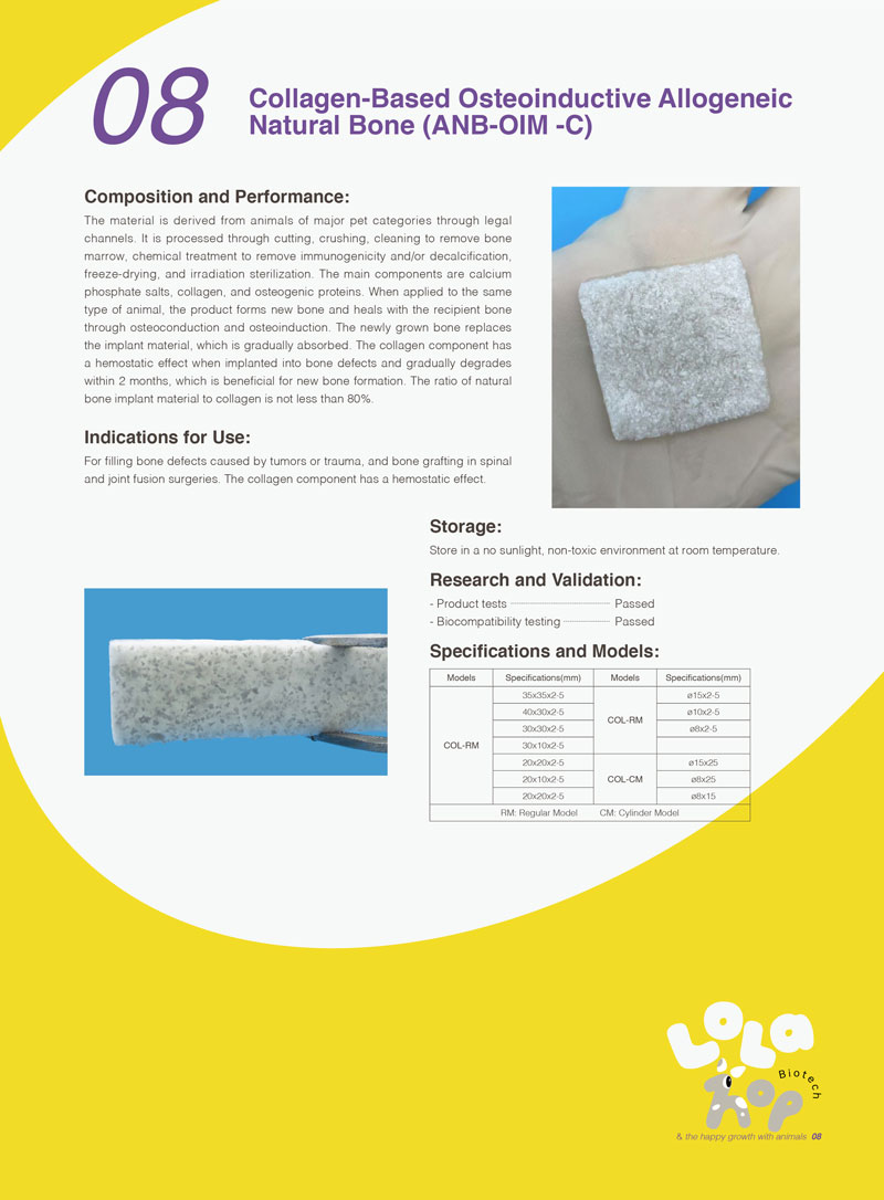 The material is derived from animals of major pet categories through legal channels. It is processed through cutting, crushing, cleaning to remove bone marrow, chemical treatment to remove immunogenicity and/or decalcification, freeze-drying, and irradiation sterilization. The main components are calcium phosphate salts, collagen, and osteogenic proteins. When applied to the same type of animal, the product forms new bone and heals with the recipient bone through osteoconduction and osteoinduction. The newly grown bone replaces the implant material, which is gradually absorbed. The collagen component has a hemostatic effect when implanted into bone defects and gradually degrades within 2 months, which is beneficial for new bone formation. The ratio of natural bone implant material to collagen is not less than 80%.