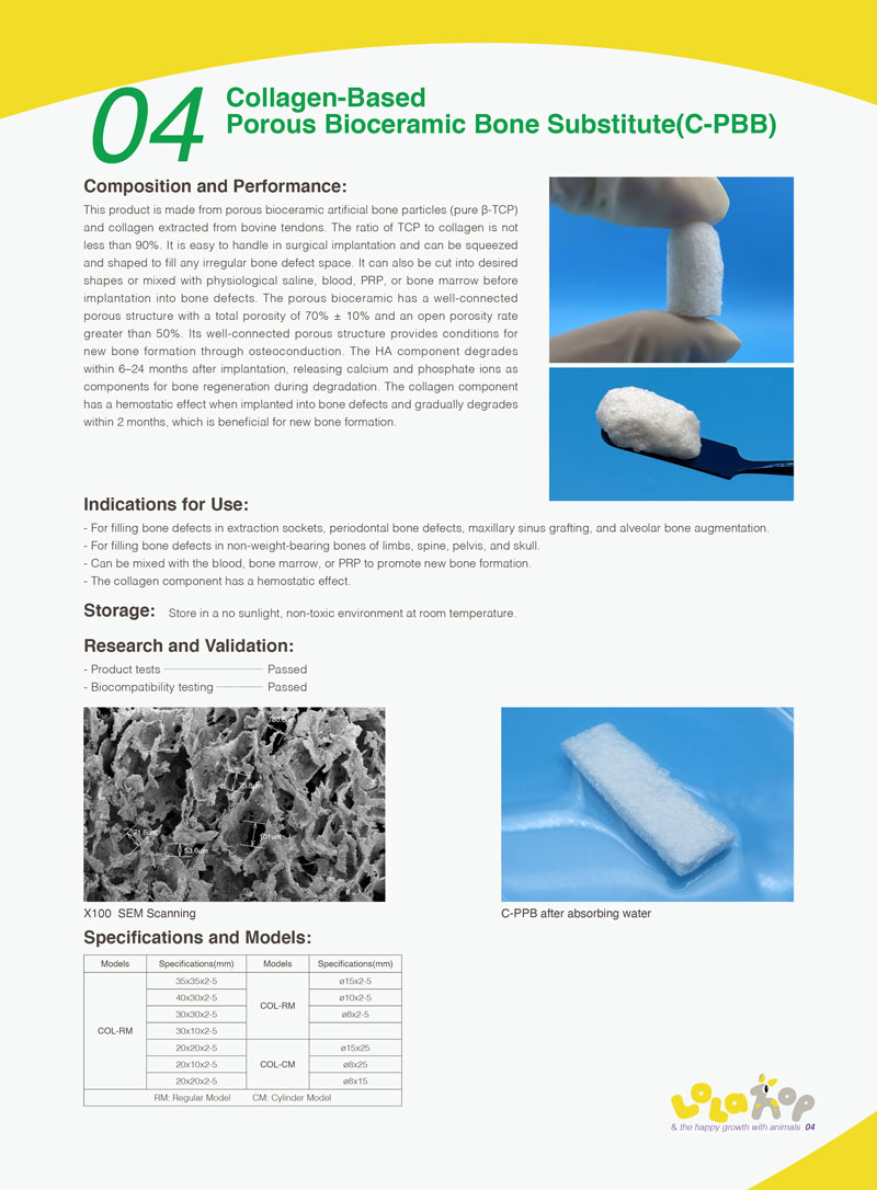 This product is made from porous bioceramic artificial bone particles (pure β-TCP) and collagen extracted from bovine tendons. The ratio of TCP to collagen is not less than 90%. It is easy to handle in surgical implantation and can be squeezed and shaped to fill any irregular bone defect space. It can also be cut into desired shapes or mixed with physiological saline, blood, PRP, or bone marrow before implantation into bone defects. The porous bioceramic has a well-connected porous structure with a total porosity of 70% ± 10% and an open porosity rate greater than 50%. Its well-connected porous structure provides conditions for new bone formation through osteoconduction. The HA component degrades within 6–24 months after implantation, releasing calcium and phosphate ions as components for bone regeneration during degradation. The collagen component has a hemostatic effect when implanted into bone defects and gradually degrades within 2 months, which is beneficial for new bone formation.