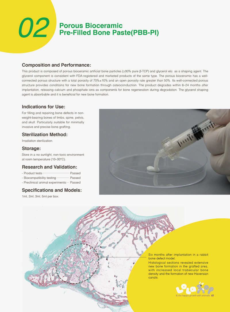 This product is composed of porous bioceramic artificial bone particles (≥30% pure β-TCP) and glycerol etc. as a shaping agent. The glycerol component is consistent with FDA-registered and marketed products of the same type. The porous bioceramic has a wellconnected porous structure with a total porosity of 70%±10% and an open porosity rate greater than 50%. Its well-connected porous structure provides conditions for new bone formation through osteoconduction. The product degrades within 6–24 months after implantation, releasing calcium and phosphate ions as components for bone regeneration during degradation. The glycerol shaping