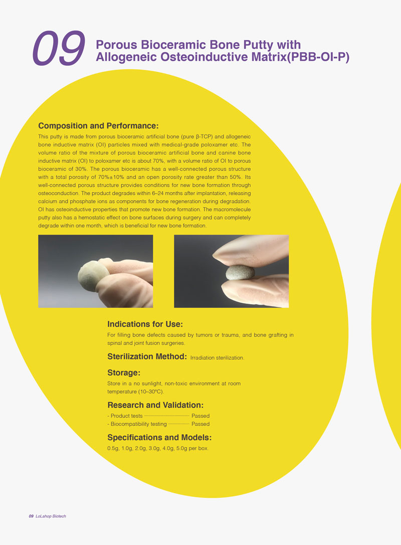 This putty is made from porous bioceramic artificial bone (pure β-TCP) and allogeneic bone inductive matrix (OI) particles mixed with medical-grade poloxamer etc. The volume ratio of the mixture of porous bioceramic artificial bone and canine bone inductive matrix (OI) to poloxamer etc is about 70%, with a volume ratio of OI to porous bioceramic of 30%. The porous bioceramic has a well-connected porous structure with a total porosity of 70%±10% and an open porosity rate greater than 50%. Its well-connected porous structure provides conditions for new bone formation through osteoconduction. The product degrades within 6–24 months after implantation, releasing calcium and phosphate ions as components for bone regeneration during degradation. OI has osteoinductive properties that promote new bone formation. The macromolecule putty also has a hemostatic effect on bone surfaces during surgery and can completely degrade within one month, which is beneficial for new bone formation.
