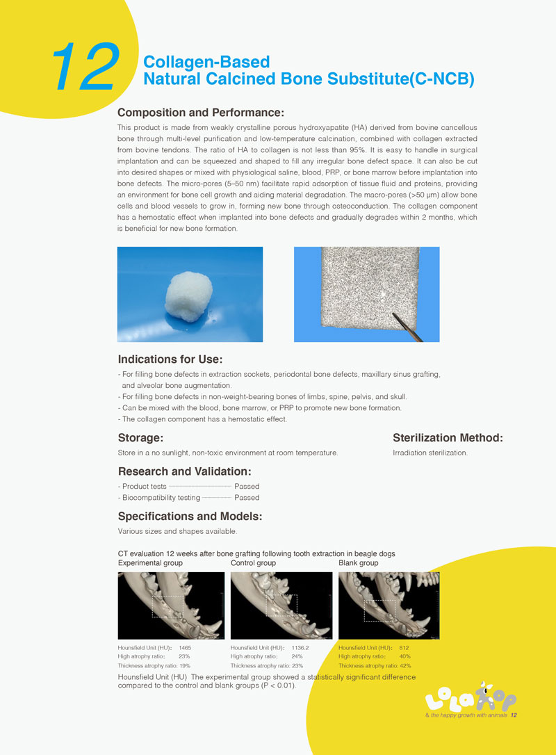 This product is made from weakly crystalline porous hydroxyapatite (HA) derived from bovine cancellous bone through multi-level purification and low-temperature calcination, combined with collagen extracted from bovine tendons. The ratio of HA to collagen is not less than 95%. It is easy to handle in surgical implantation and can be squeezed and shaped to fill any irregular bone defect space. It can also be cut into desired shapes or mixed with physiological saline, blood, PRP, or bone marrow before implantation into bone defects. The micro-pores (5–50 nm) facilitate rapid adsorption of tissue fluid and proteins, providing an environment for bone cell growth and aiding material degradation. The macro-pores (>50 µm) allow bone cells and blood vessels to grow in, forming new bone through osteoconduction. The collagen component has a hemostatic effect when implanted into bone defects and gradually degrades within 2 months, which is beneficial for new bone formation.