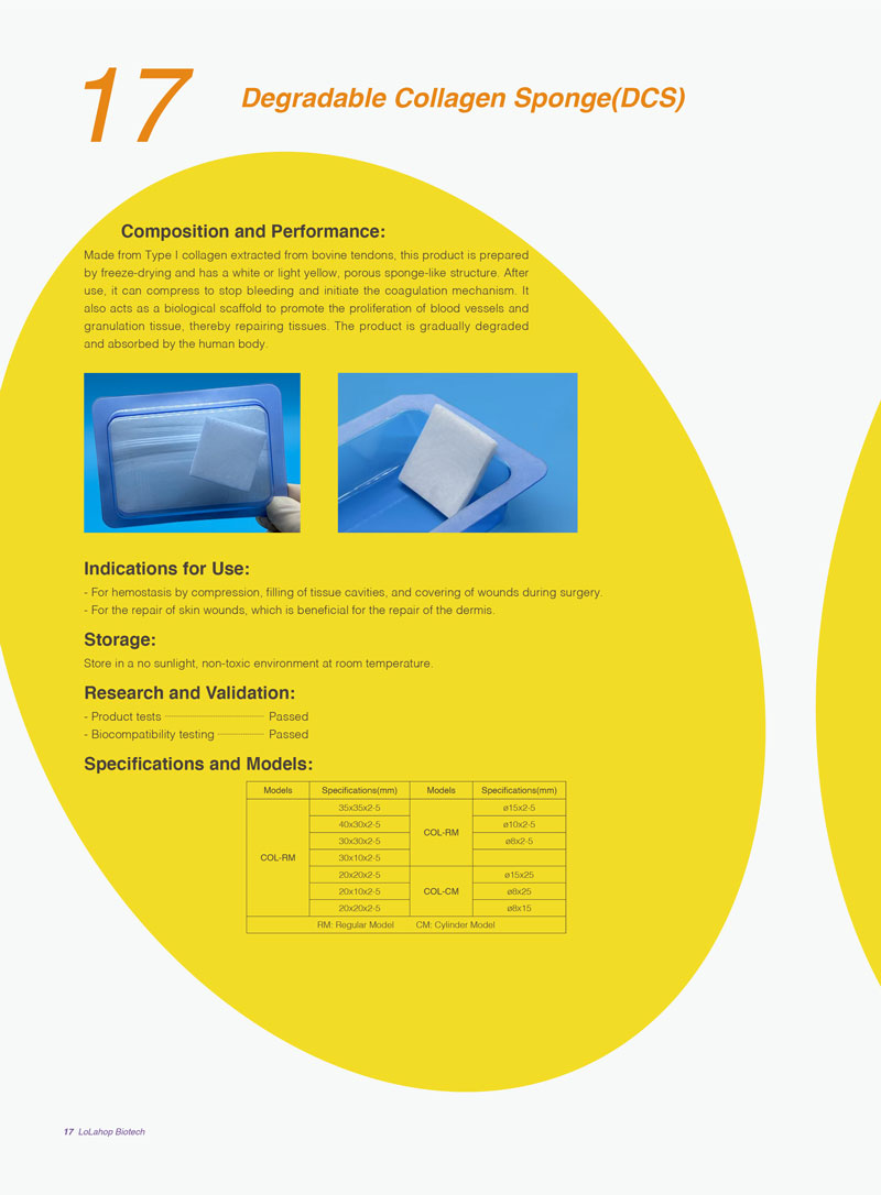 Made from Type I collagen extracted from bovine tendons, this product is prepared by freeze-drying and has a white or light yellow, porous sponge-like structure. After use, it can compress to stop bleeding and initiate the coagulation mechanism. It also acts as a biological scaffold to promote the proliferation of blood vessels and granulation tissue, thereby repairing tissues. The product is gradually degraded and absorbed by the human body.
